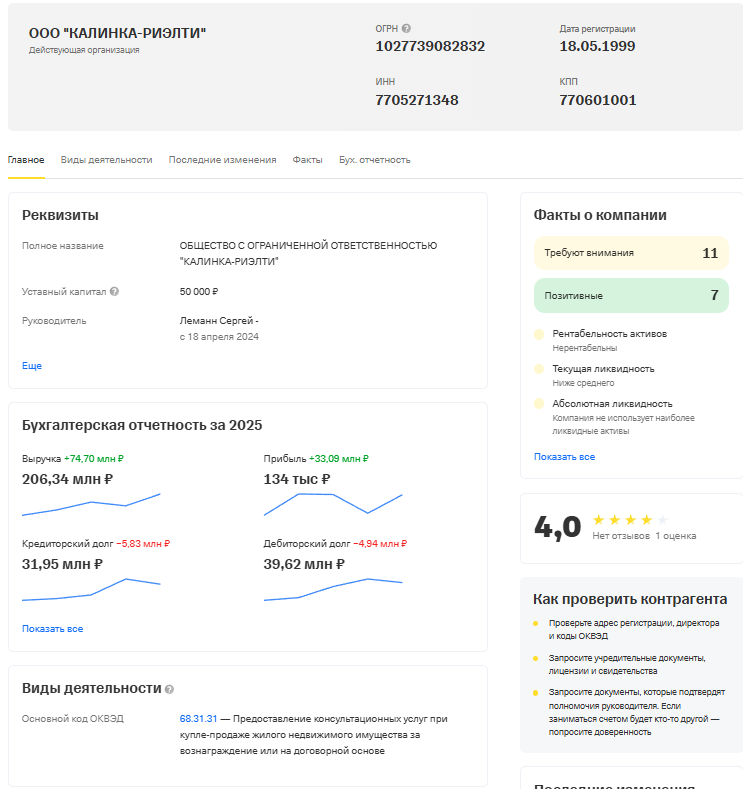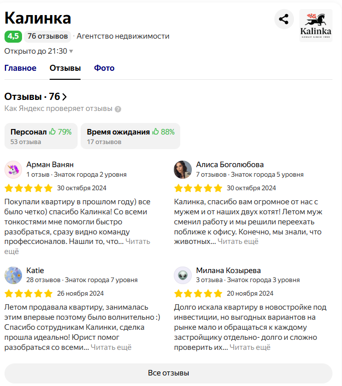 Агентство работает с 1999 года, имеет положительную репутацию. Однако заметим, что у ООО КАЛИНКА РИЭЛТИ нет ОКВЭД, связанных с обучением. Не исключено, что для академии есть другое юрлицо или регистрация на ИП, но информации об этом нет.