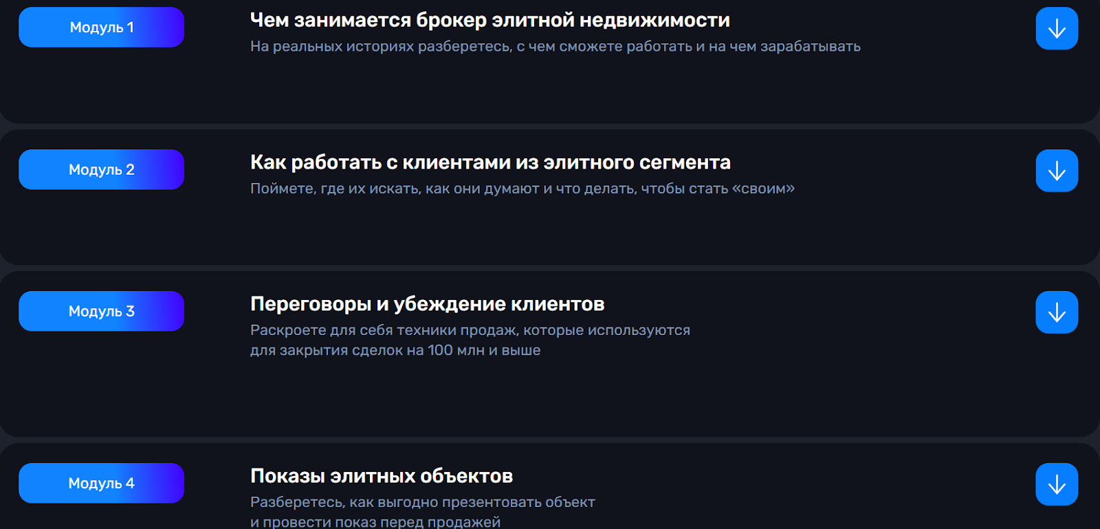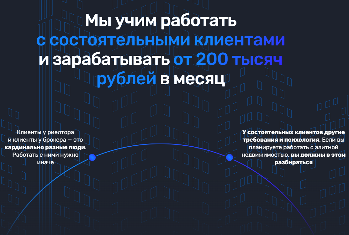 При этом заметим, что в описании указывается уровень дохода, на который могут претендовать выпускники. Такой подход может быть не самым честным, ведь заработок зависит от множества параметров, особенно, если до этого момента ученики не работали в сфере недвижимости.