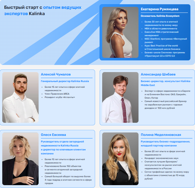 Kalinka Academy – образовательный проект от агентства элитной недвижимости Kalinka. Пользователям предлагаются программы обучения для риэлторов и брокеров недвижимости. Специалисты платформы заявляют, что с ними можно начать зарабатывать больше, получить навык работы с состоятельными клиентами. Проект Kalinka Academy отзывы получить не успел, мы провели его проверку.