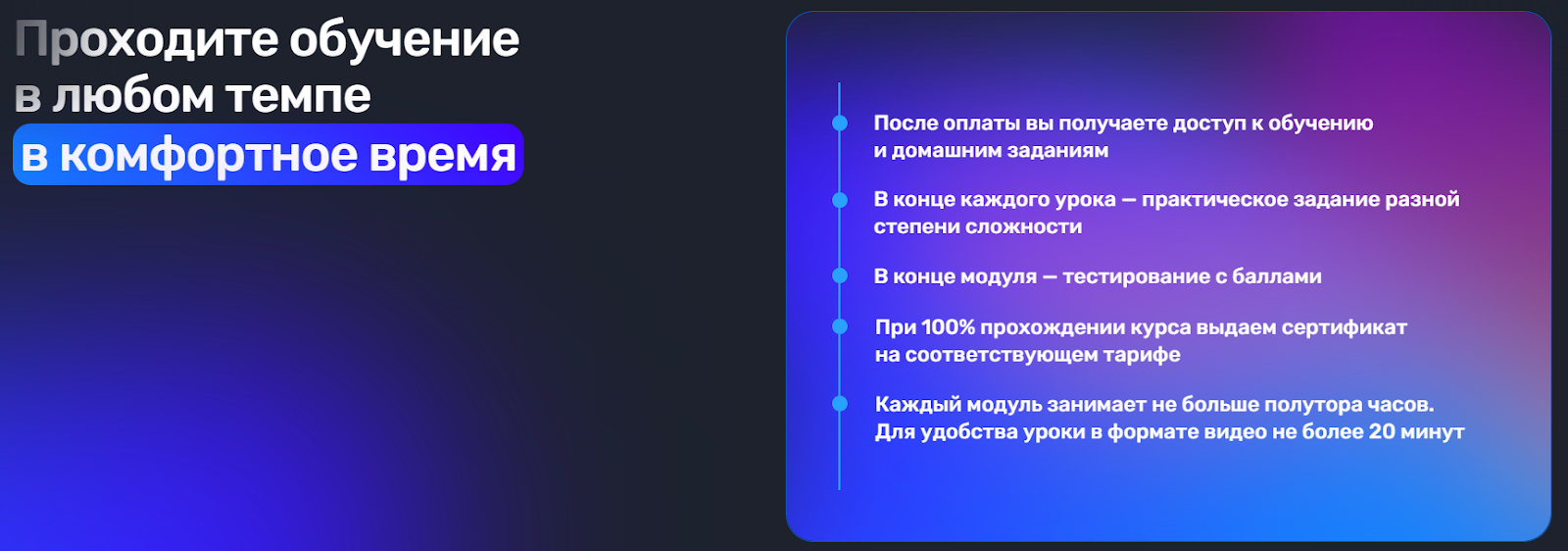 Стоимость обучения стартует от 49 тысяч рублей и доходит до 130 тысяч. Но при это, судя по описанию, для учеников подготовлены предзаписанные уроки, так как набора на программы нет. Это может быть не самым позитивным фактором.
