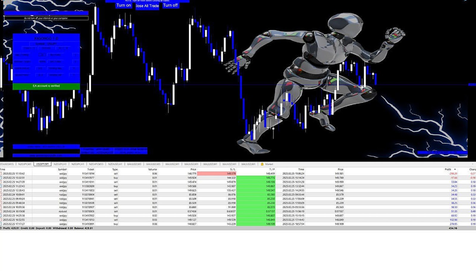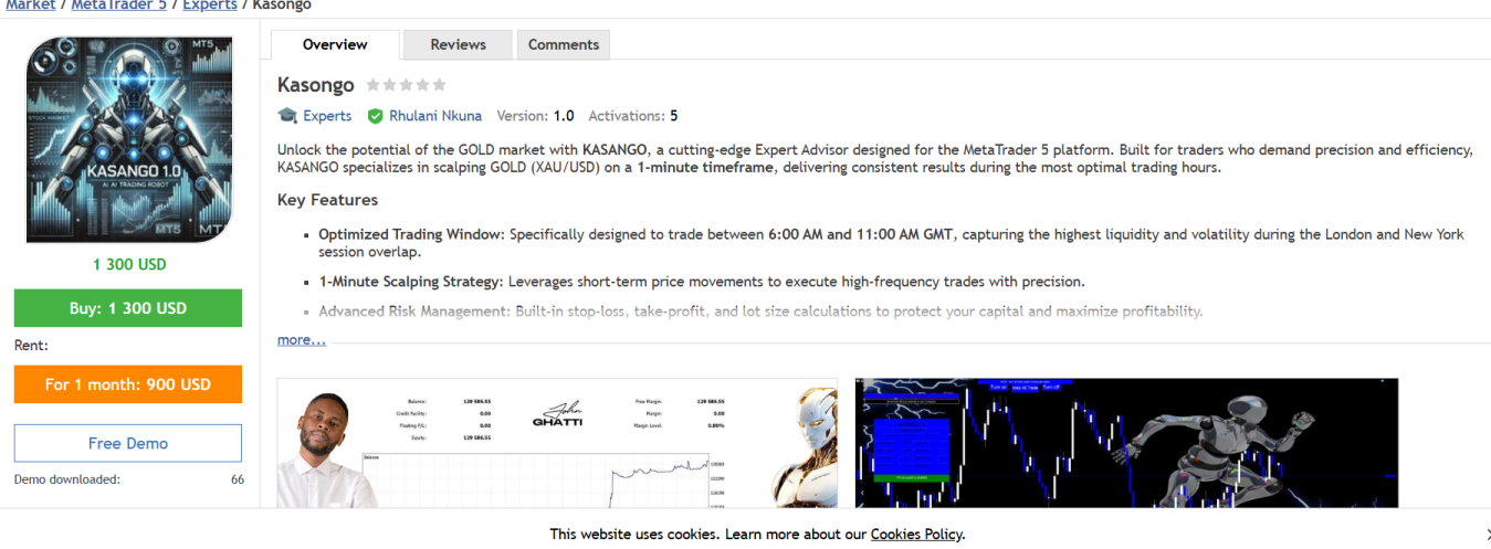Основатель советует выбрать валютную пару золото XAU\USD, таймфрейм 1 минуту. Kasongo bot продается за 1 300 долларов. Также можно совершить ежемесячный платеж в 900 долларов.