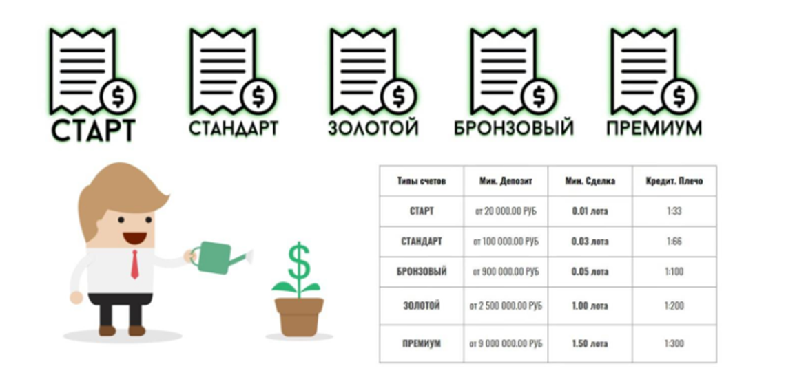 Тарифов всего 5: “Стартовый”, “Стандартный”, “Бронзовый”, “Золотой” и “Премиальный”. Минимум для внесения — 20 000, на стартовом тарифе, на премиальном тарифе можно внести на счет до 9 миллионов рублей.