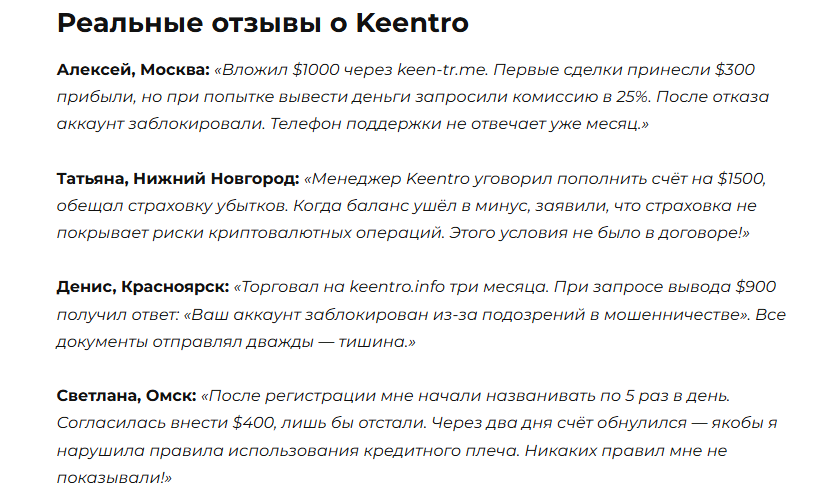 Keentro info отзывы получает негативные, и все они указывают на развод. Так, Алексей жалуется на непредвиденные комиссии при выводе денег и блокировку аккаунта. Остальные пользователи также жалуются на внезапные блокировки под разными предлогами, от обвинения в мошенничестве, до нарушения правил, которые не указаны на сайте.