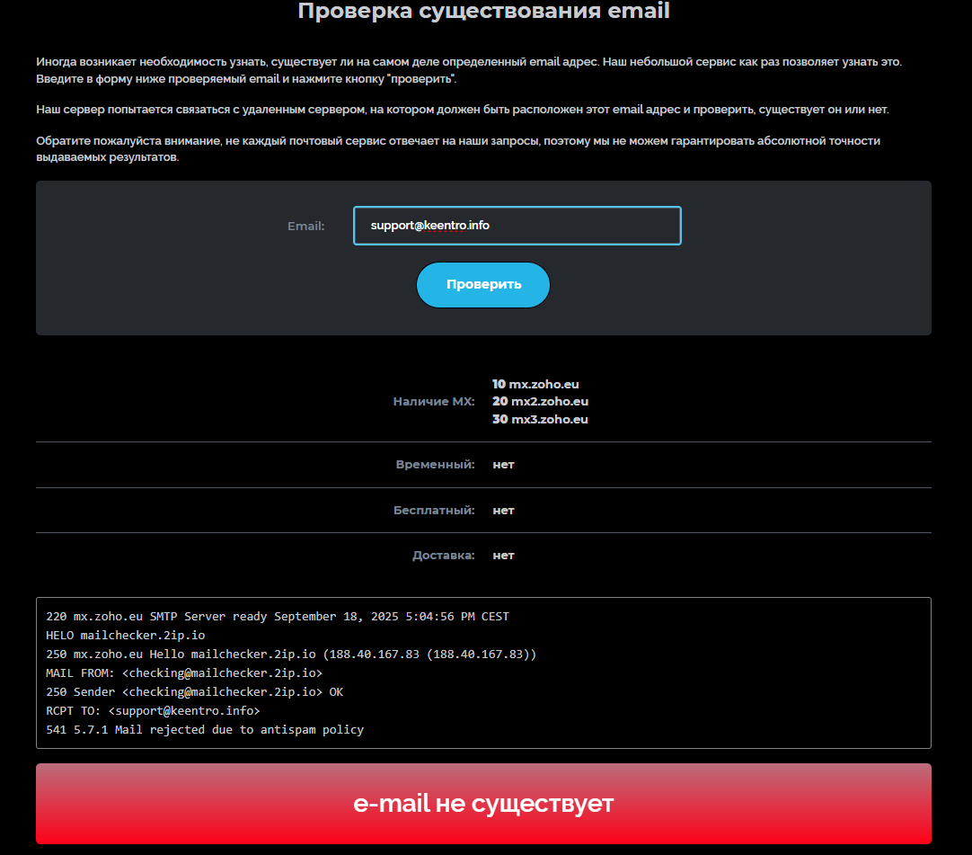 Перед тем, как перейти к анализу отзывов про keen-tro pro, мы решили проверить электронную почту через 2ip, которую нашли на сайте брокера – support@keentro info.