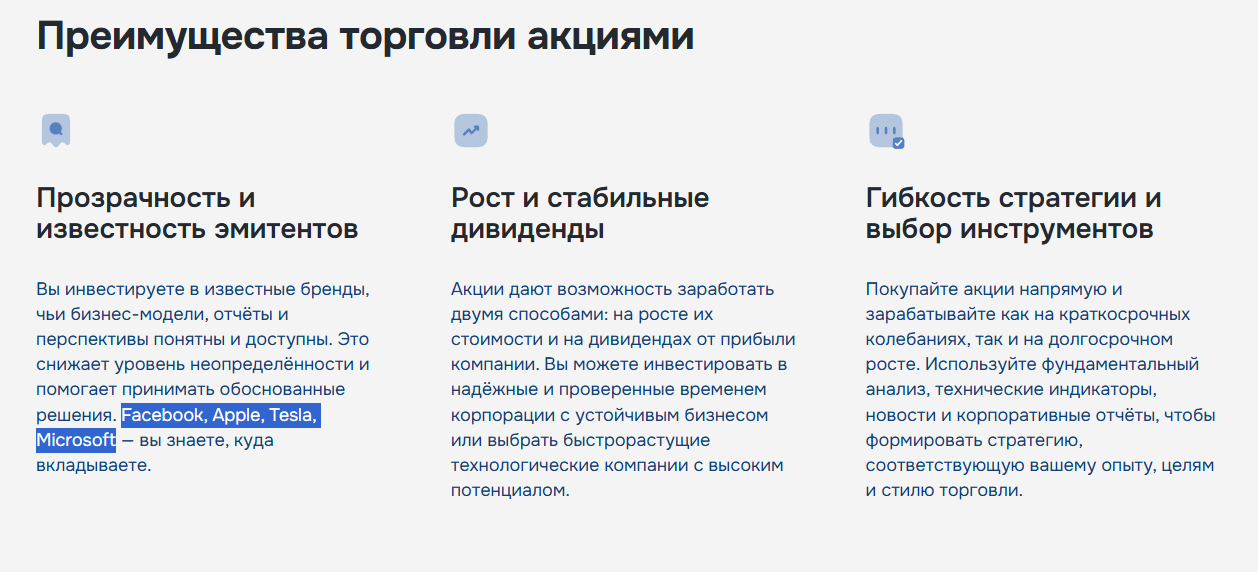 Биржевик «Кеентро» подробно расписывает о каждом рынке, доступ к которому предоставляет, например среди акций доступны бумаги таких корпораций как Tesla, Apple, Facebook и Microsoft, которые стоят больших денег.