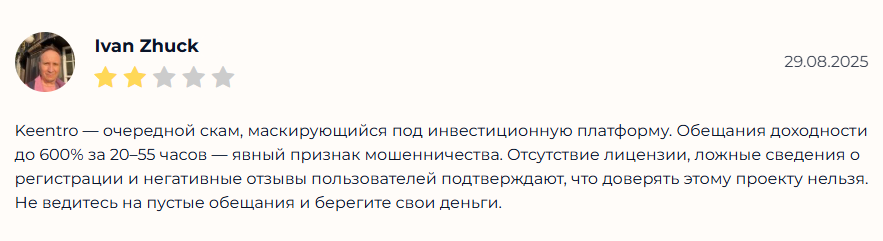 Первый отзыв от Ивана. Он рассказывает о том, почему KeenTro является обманом с приведением точной статистики. Брокер обещает шестикратную доходность за короткий период времени, при этом не имея лицензий и отрицательные отзывы в соцсетях. Иван просит не вестись на уловки биржевика и беречь свои средства.