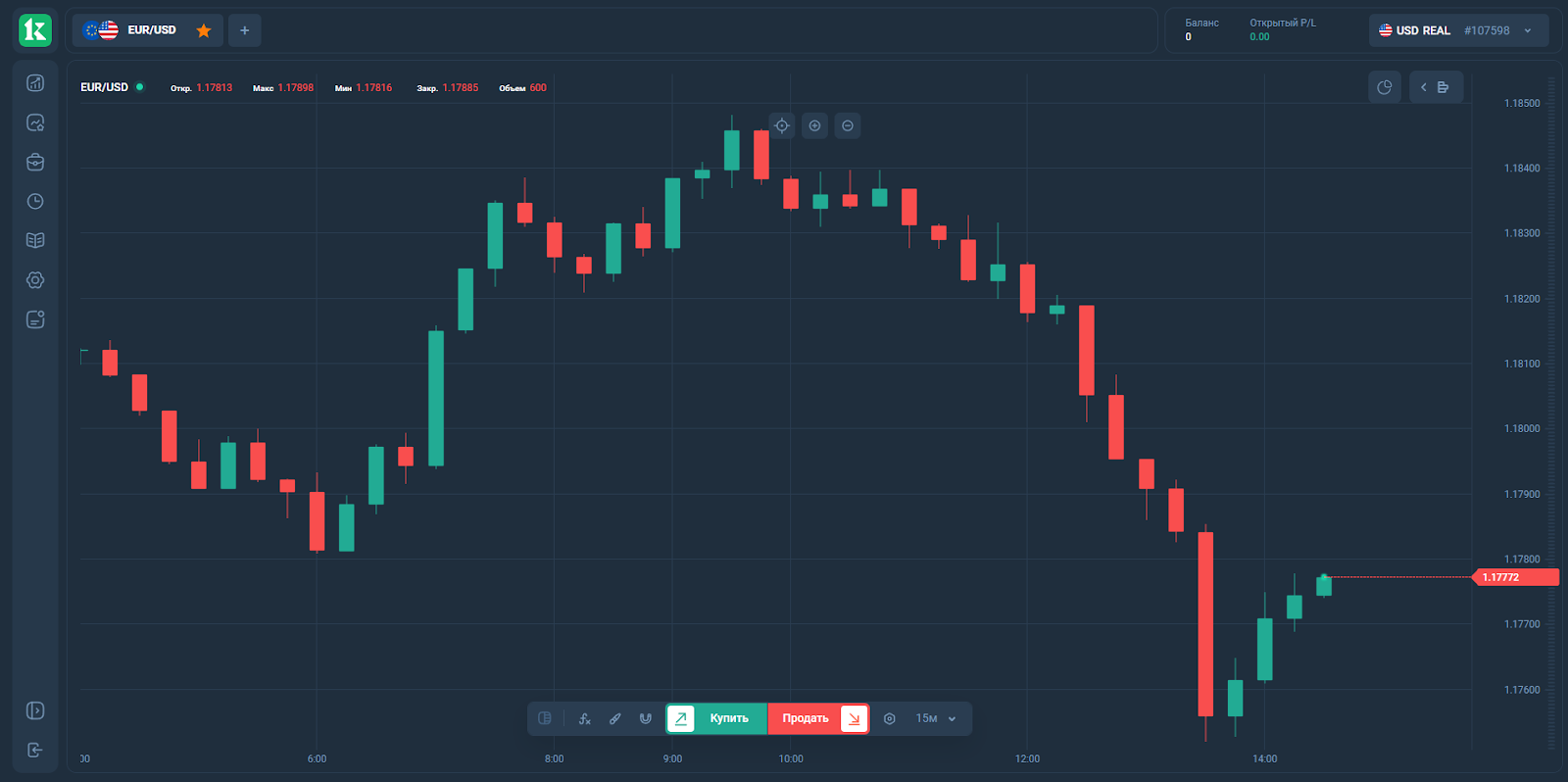 Терминал «Кинтро», где клиент сможет реализовать все бонусы от выбранного счёта выглядит очень простым. Он не располагает сложными аналитическими функциями для проведения логических цепочек исходя из данных графика выбранной валюты.