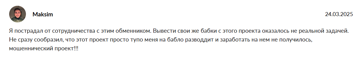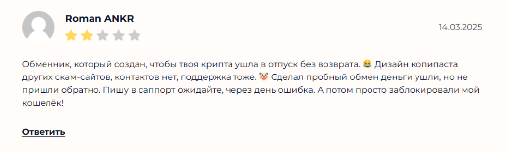 - Отзывы у обменника негативные, его называют скамом и жалуются на невозможность вывести деньги, значит, положительной репутации у проекта нет.