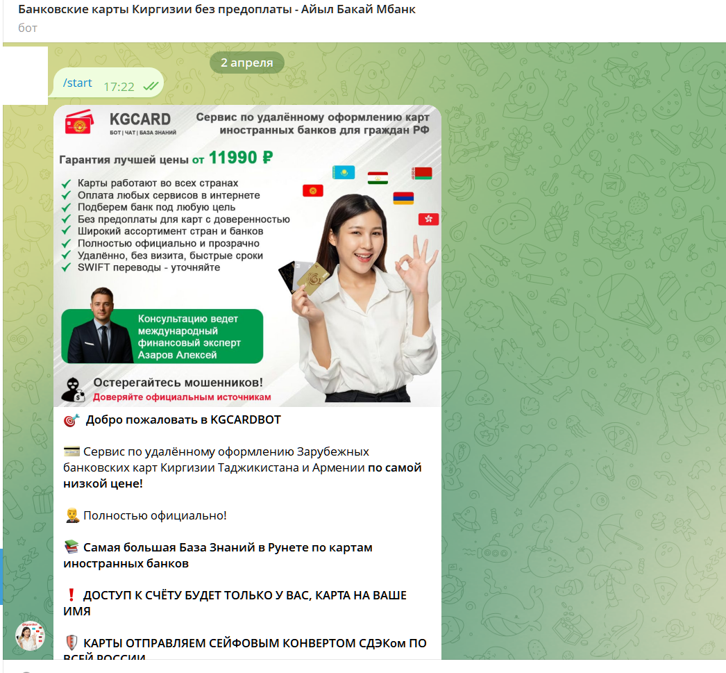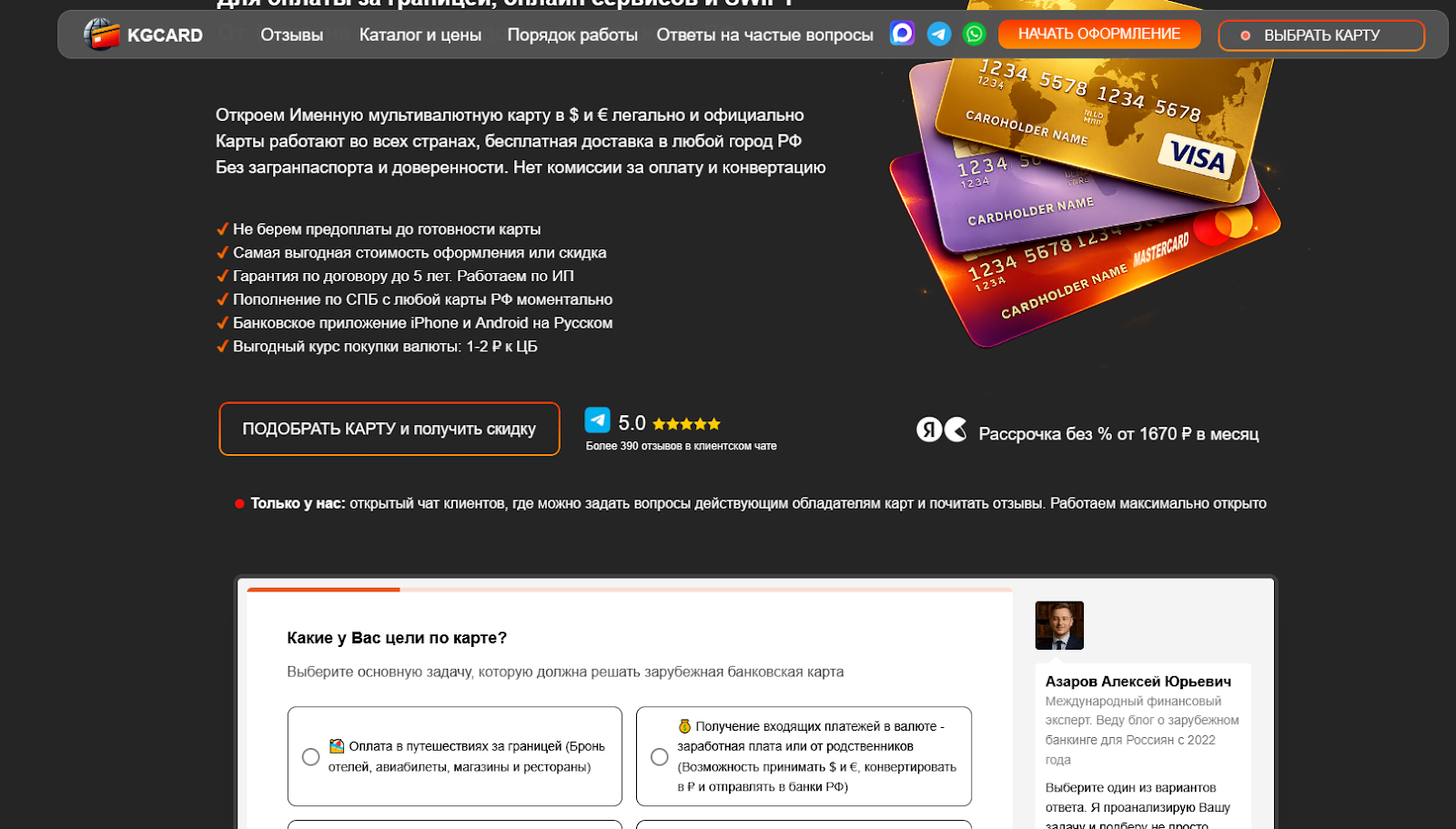 Банковскую карту официально оформляет посредник Азаров Алексей Юрьевич, работающий в РФ официально, как индивидуальный предприниматель. Компания Kg Card работает без предоплаты. Все услуги посредника оплачиваются после получения «пластика».