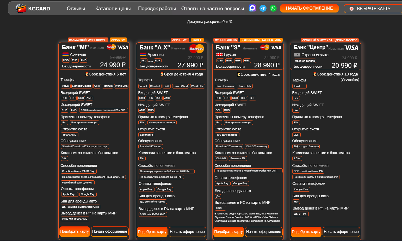 Фирма содействует в оформлении банковских карт VISA банков Кыргызстана, Грузии, Армении, Таджикистана. Пластик присылают через СДЭК, но необходима 100% предоплата за услуги.