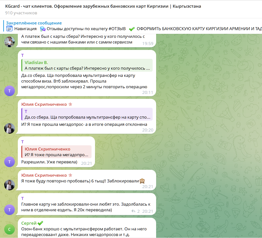 В ТГ канале Kg Card отзывы пользователей неоднозначные. Многие люди сообщают, что «Сбербанк» и «ВТБ» перестали осуществлять онлайн транзакции, есть сбои в работе онлайн приложения, сложности с выводом средств.