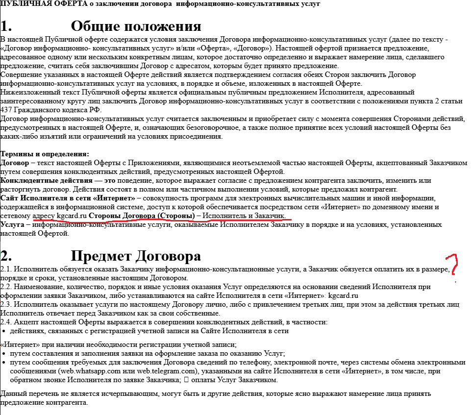 Но внимательно изучив договор оферты, который заключается между посредником и заказчиком мы нигде не нашли данных, что ответственность за оказание услуг несет ИП Азаров Алексей Юрьевич. В Договоре исполнителем является ноунейм сайт «кгкард ру». Предъявлять судебные исковые претензии о возврате средств к сайту бессмысленно.
