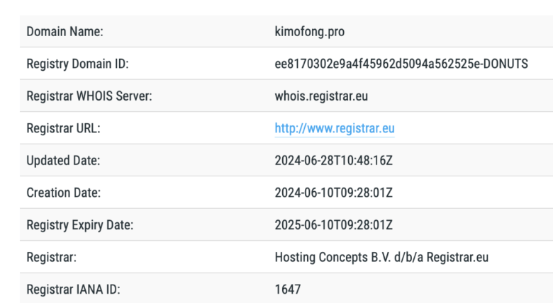 Компания Kimofong утверждает, что ведет работу с 2017 г. и с тех пор укрепила позиции на рынке, имеет хорошую репутацию, расширяет ассортимент услуг и качество поддержки. Проверка доменного имени сайта показала, что брокер работает с июня 2024 г. Этот факт вызывает сомнения в надежности фирмы