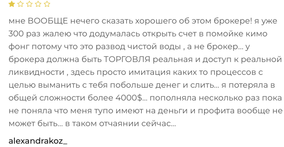 Все, кто прибегал к услугам брокера Kimofong, утверждают, что это развод на деньги. Здесь можно только потерять средства, организаторы этого бизнеса занимаются мошенничеством. При настойчивых попытках вывести хотя бы депозит клиентов ждет блокировка.