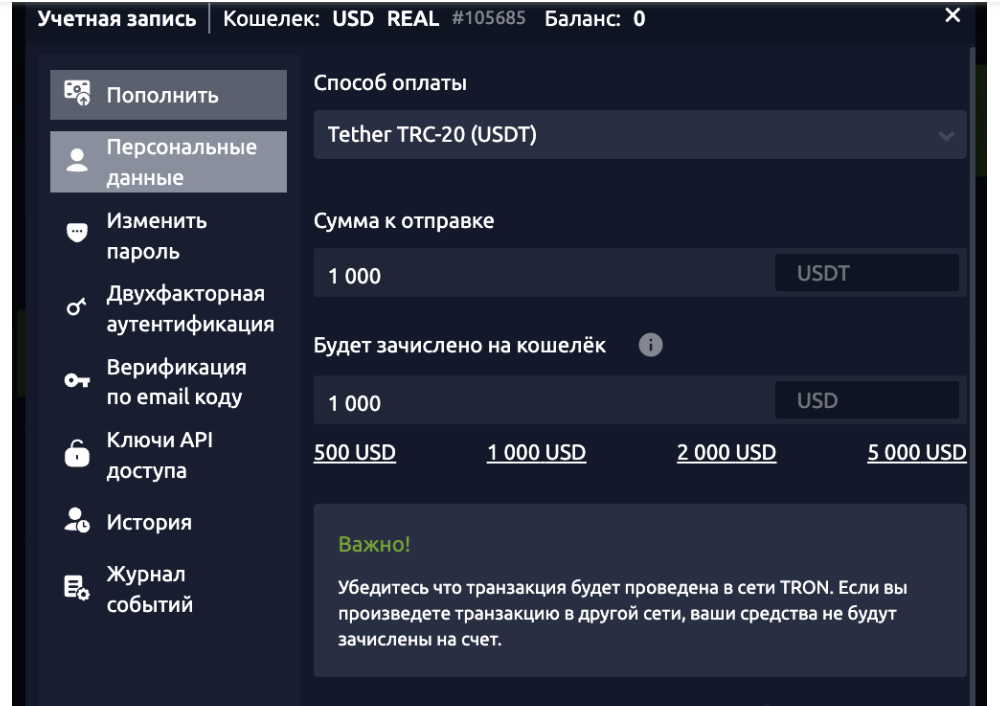 Для начала торгов требуется внесение валютного депозита. Минимальная сумма — 150 $, внести которые предлагают с помощью любого платежного средства. Пополнить баланс можно криптовалютами Bitcoin и USDT на крипто-кошелек TRON, причем навязывается размер платежа в 1000 UDT.