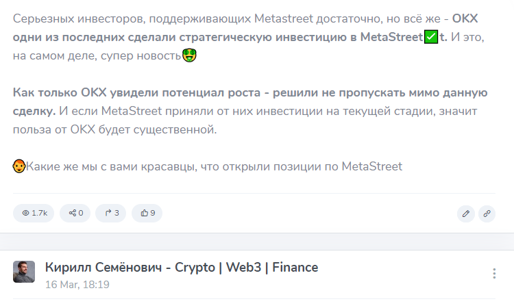 Например, на его канале можно найти в продаже скам-токены ZYA, OTX по низкой стоимости, которые мы не рекомендуем к покупке. Инвестор рассказывает о том, что нужно вкладывать в альтернативные токены и рекомендует такие как MetaStreet. Скорее всего это еще один фейковый токен, и он не принесет прибыли. Причем на канале выставляются инструкции по покупке и продаже монет MetaStreet. Инструкции для остальных токенов либо слабо представлены, либо их нет вообще на канале «Кирилл Семёнович Crypto Web3 Finance»