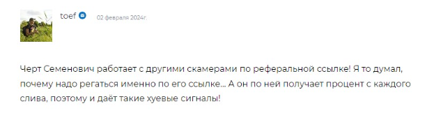 Судя по отзывам о «Кирилле Семёновиче Крипто», можно сказать, что он принес убыточные сигналы большей части своих инвесторов. Он также получает проценты за то, что нужно регистрироваться на биржах по его реферальной ссылке.