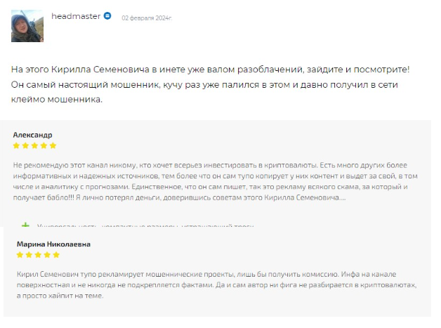 Часть трейдеров, посещающих его канал, утверждает, что «Кирилл Семенович Крипто» копирует новости из других групп в Телеграмм, переделывает под себя и выставляет на показ новичкам, которые не разбираются в торговле инвестициями.