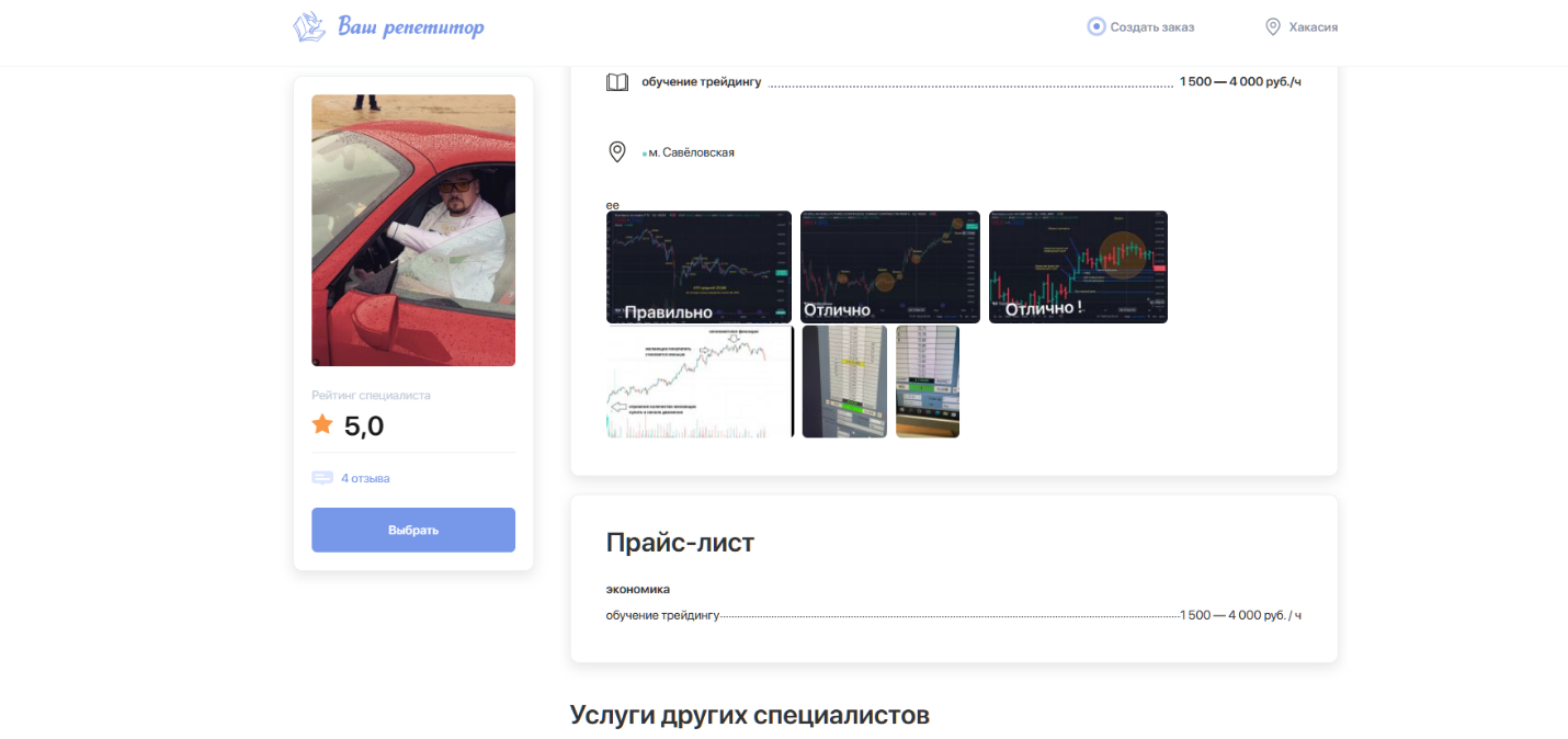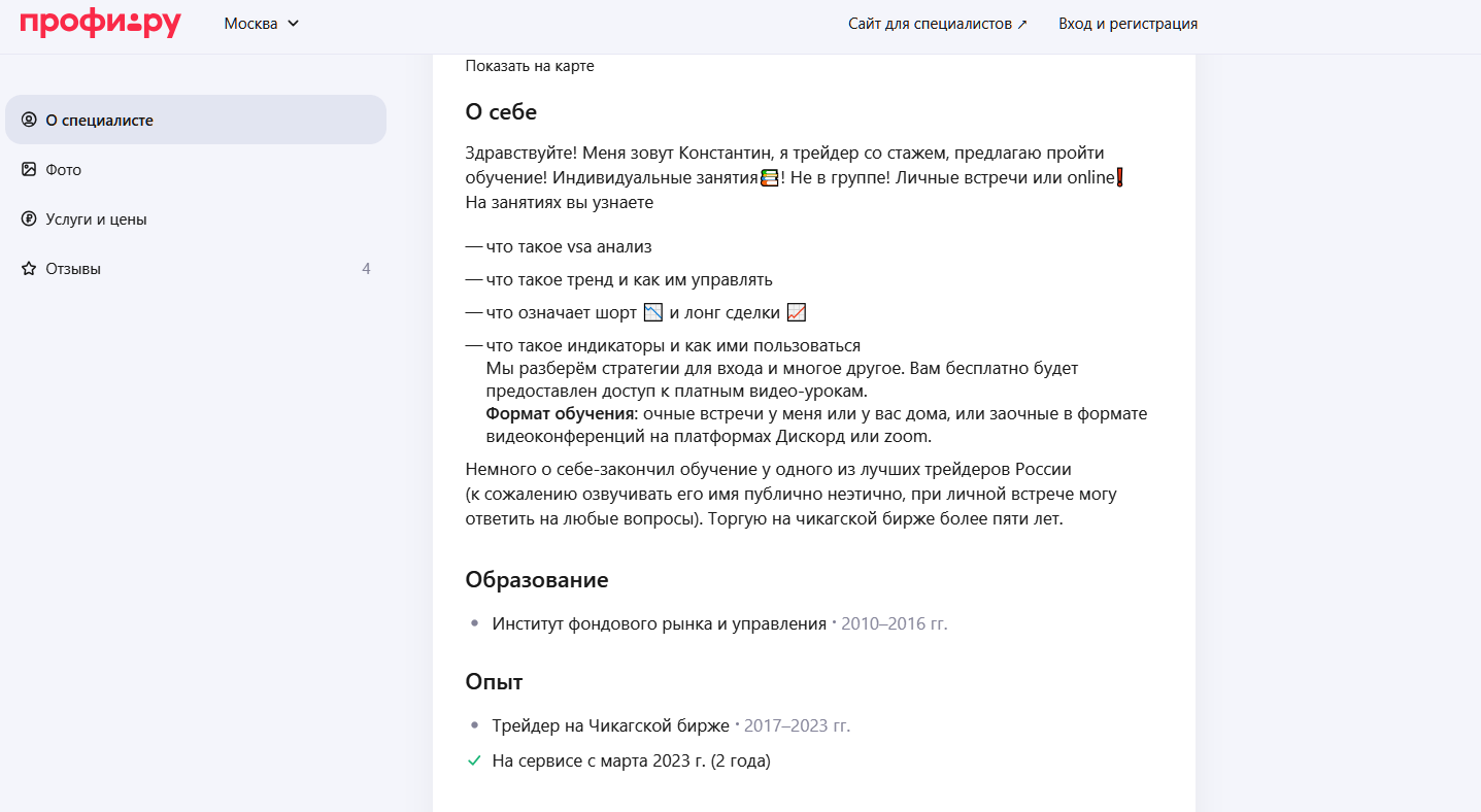 Больше информации про наставника в сети найти не удалось. Нам показалось странным, что человек, успешно работающий на бирже Чикаго, находит время, чтобы ездить к ученикам на дом и преподавать трейдинг индивидуально.
