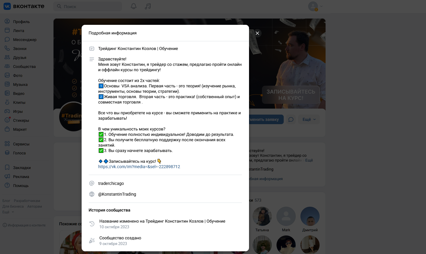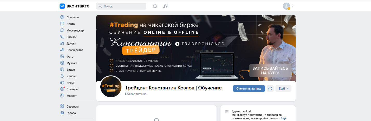 Основной канал в VK Константин Козлов трейдер максимально засекретил. Хотя наставнику стоит озаботиться привлечением аудитории, так как подписок на проект всего 573 штуки. Подход трейдера к поиску потенциальных клиентов напоминает репетиторство из 90-х годов.