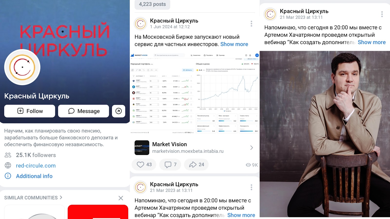 В сообществе выкладываются рекомендации по финансовой независимости, новости Мосбиржи и прочее. Контент публикуется реже, чем в Телеграмм канале.