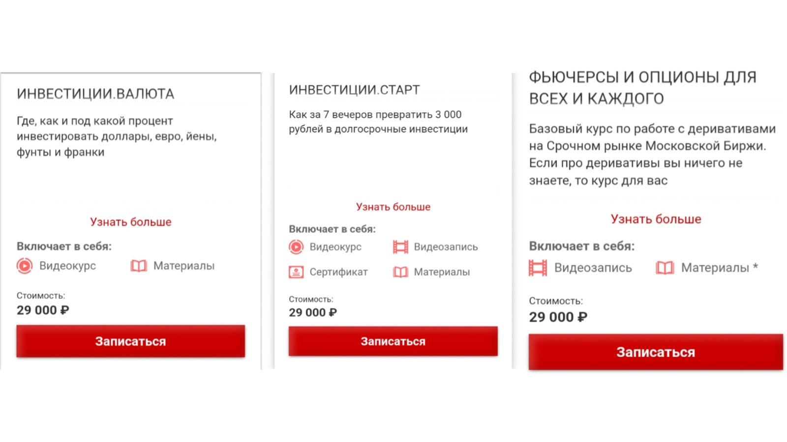 - “Инвестиции Валюта”. Пользователям обещают рассказать про инвест. возможности для валют, научить покупать иностранные акции и составлять портфель. Предложено 10 уроков по 2 часа (видеоматериалы + вебинары), стоит курс 29 000 рублей;