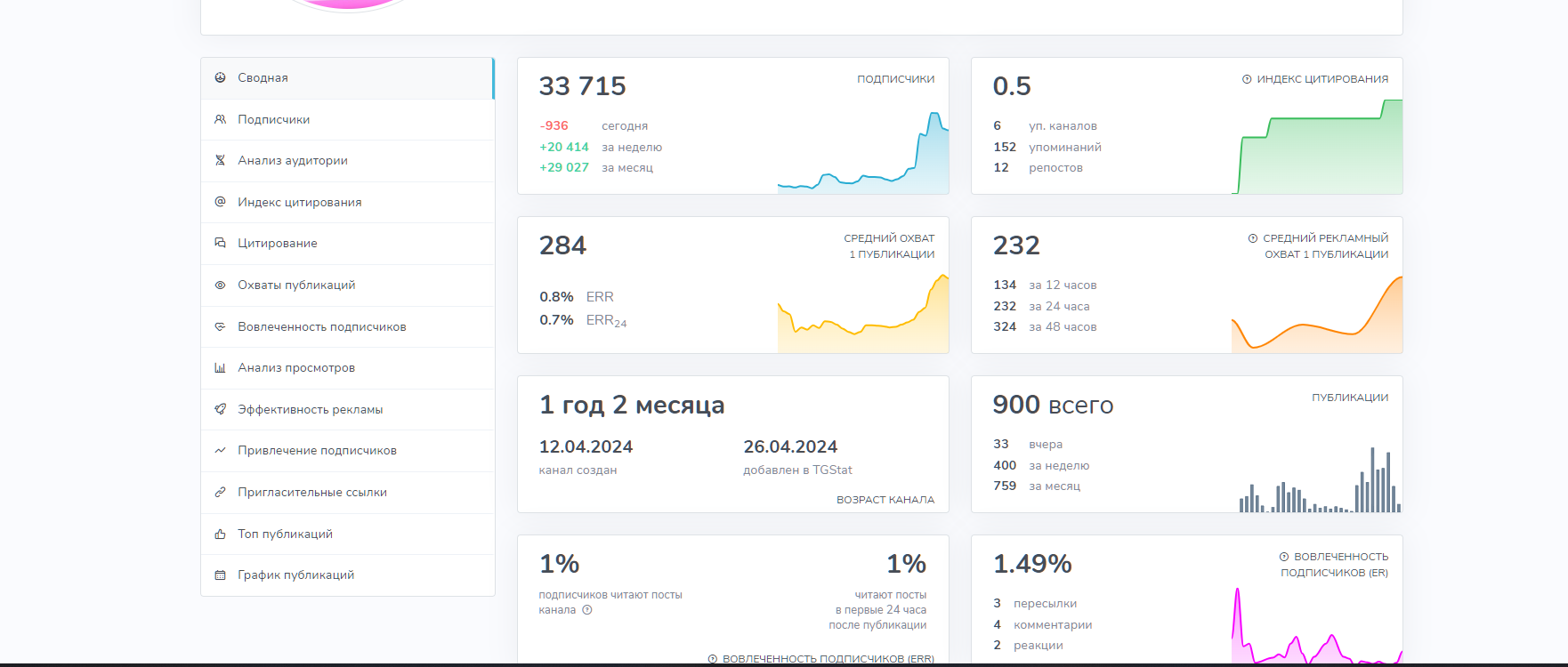 Аналитика «Телеграм» показывает, что за месяц на канал подписалось 29 027 человек. Аудитория проекта насчитывает 33 715 подписчиков. За один день площадку покинуло 936 подписчиков.