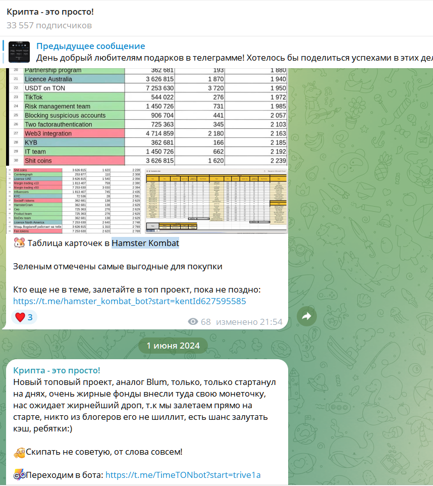 Сначала автор прогревал аудиторию, рекламировал достойные проекты заработка, такие как Blum, Hamster Kombat, Trivea. В основном трейдер специализировался на продвижении тапалок. Старался создать впечатление, что репутация у канала хорошая, переходя по ссылкам можно неплохо заработать.