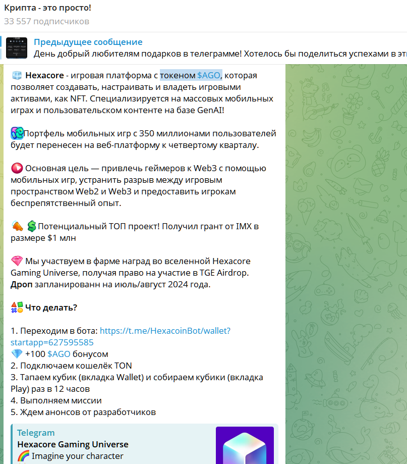 Но параллельно с неплохими бесплатными проектами заработка на играх, в ТГ канале mlimusik рекламировались и скам токены, которые невозможно продать и обменять. Например, игра с заработком внутренней игровой валюты AGO проекта Gexagon и майнинг бесполезных токенов в CYBASE Farm Bot.