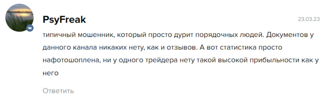 На сторонних сервисах можно встретить только отрицательные комментарии. Люди пишут, что это типичный мошенник. Пользователи утверждают, что вся статистика нафотошоплена, по сигналам трейдера можно торговать только в убыток себе.