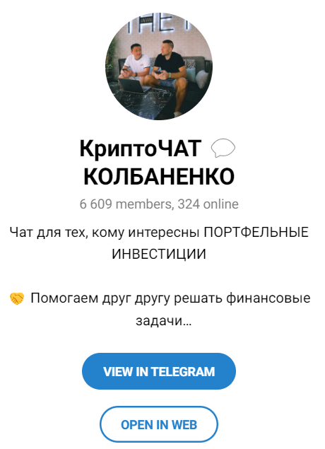 Третий телеграмм-канал посвящен общему чату. Здесь могут общаться все пользователи, подписавшиеся на группу, ученики, прошедшие курсы. В сообществе публикуются новости с инвестиционного рынка, криптовалютные спекуляции, торговые сигналы. Люди, по словам автора, помогают друг другу зарабатывать через этот чат Kolbanenko chat.