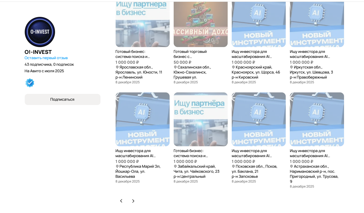 Скамеры размещают на «Авито» от имени несуществующей компании O Invest предложения по инвестициям в готовый бизнес. Покупатель может выбрать любое направление деятельности своей будущей коммерческой компании: