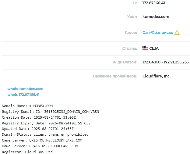Биржа KumoDex работает с 24.08.2025, а ее домен оформлен неизвестными у провайдера из США CloudFlare. Это уже подозрительно, особенно если учесть отсутствие внятных данных о контактах платформы.