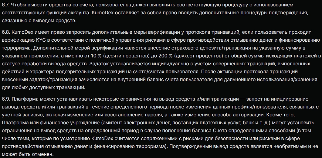 Кураторы брокера рассказывают — они не работают с клиентами из США и ряда других стран, а также теми, кто находится под санкциями этой страны, Евросоюза и ООН. При желании биржа KumoDex может подвести под блокировку активов любого, но это не все возможные риски для трейдеров.