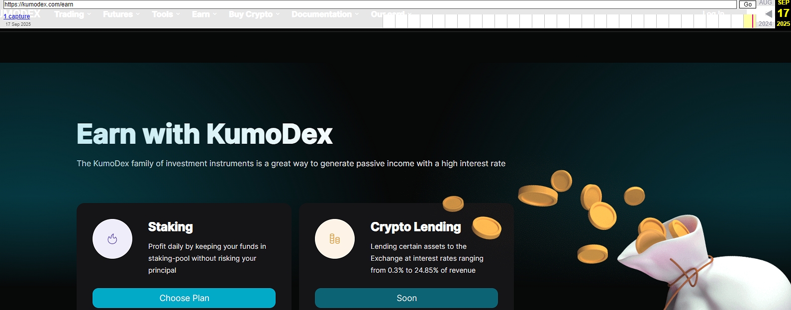 KumoDex Technologies Limited — площадка для обмена и стейкинга крипты, а также торговли на спотовом и фьючерсном рынках. Владельцы описывают ее брокером и якобы зарегистрированы где-то в Панаме, но при этом почему-то нацелены на работу с трейдерами из РФ. Далее проанализируем их предложения и безопасность подписки на них, чтобы случайно не попасть на обман.