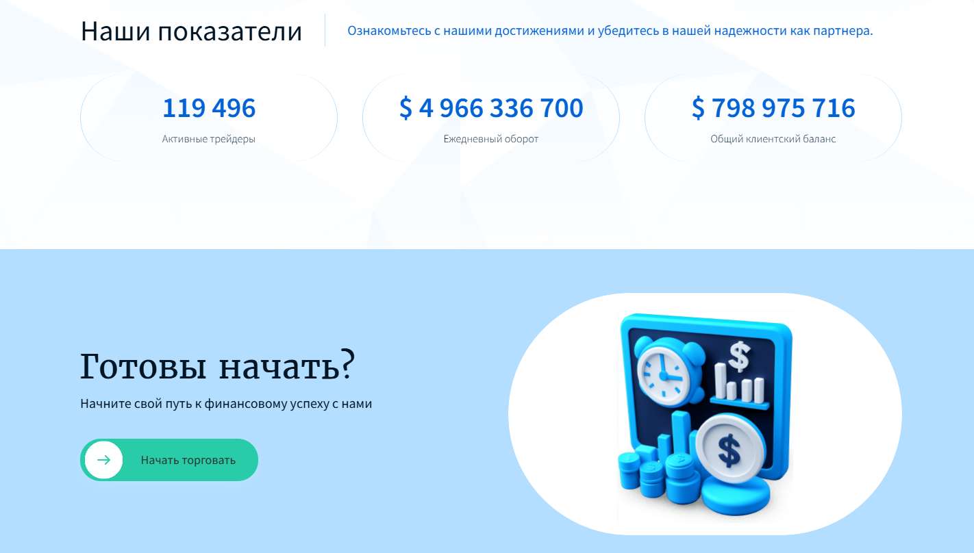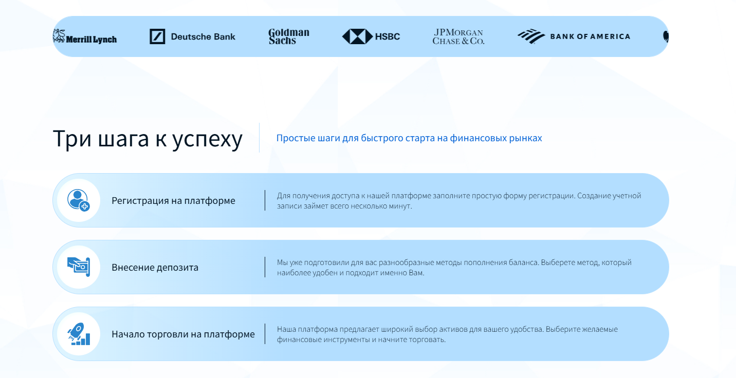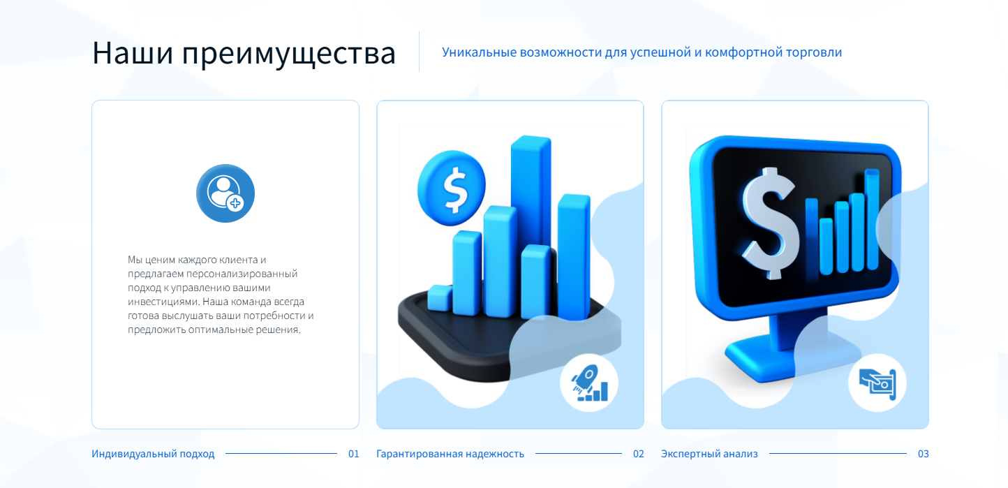 Дизайн приятный, но шаблонный. Такую структуру применяли и компании, которые были уличены в мошенничестве. Это негативно сказывается на восприятии организации, за привлекательной внешностью может скрываться обман.