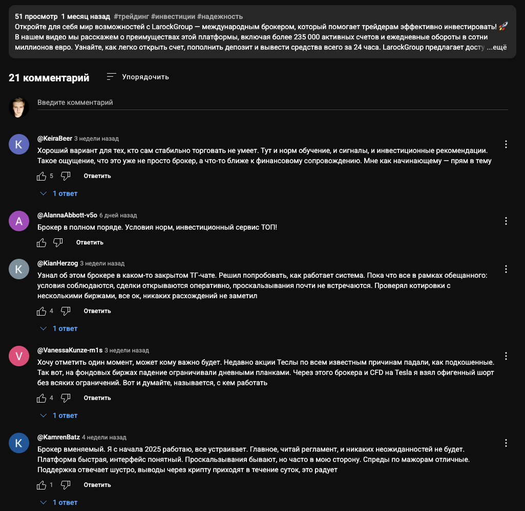 - положительные отзывы о LarockGroup поддельные — это показывает, что владельцы бизнеса не честны с клиентами;