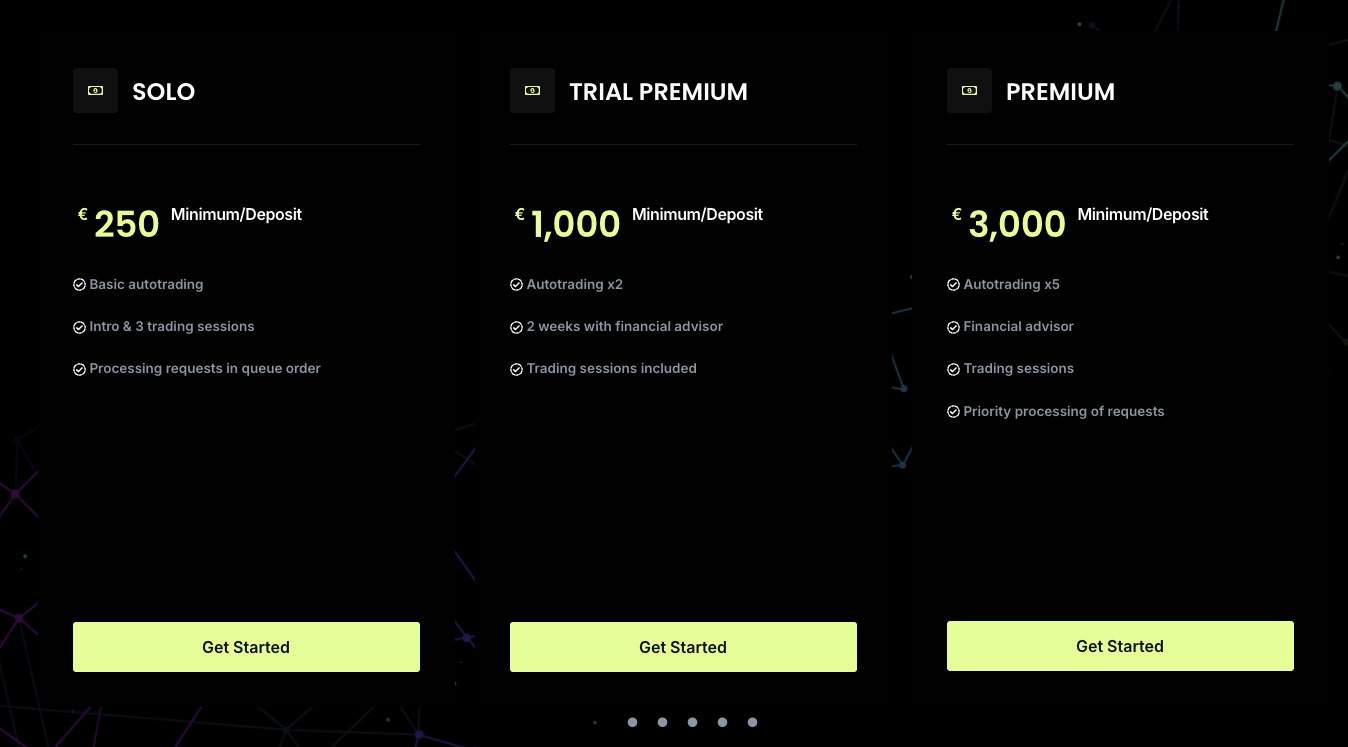 Размер минимального депозита, который нужно внести на баланс счета этой платформы, составляет 250 евро. Информации о спредах и комиссии в рекламных материалах площадки нет.