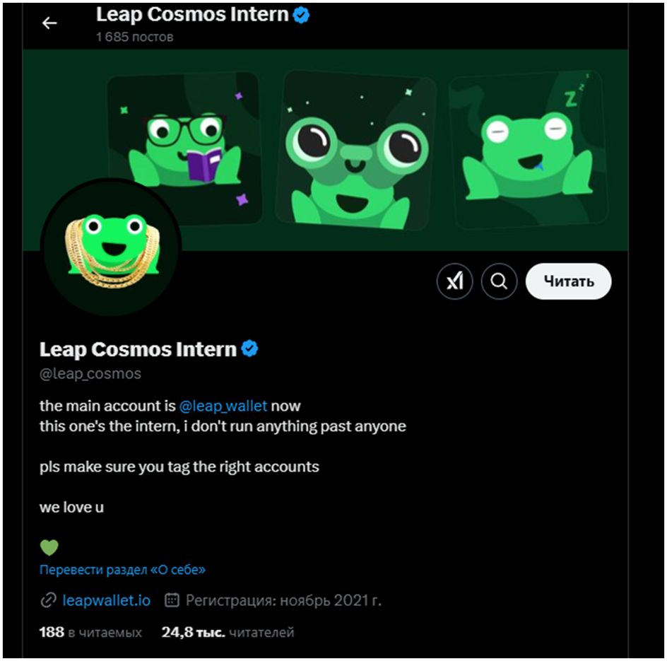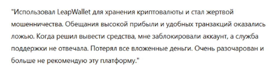 • платформа LeapWallet не предоставляет юридические сведения, что может быть связано с рисками для клиентов;