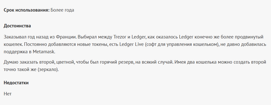 В хороших отзывах о кошельке Ledger com пользователи рассказывают, что модель оказалась более продвинутой, чем ее конкуренты, а все операции происходят быстро и не требуют дополнительного участия.