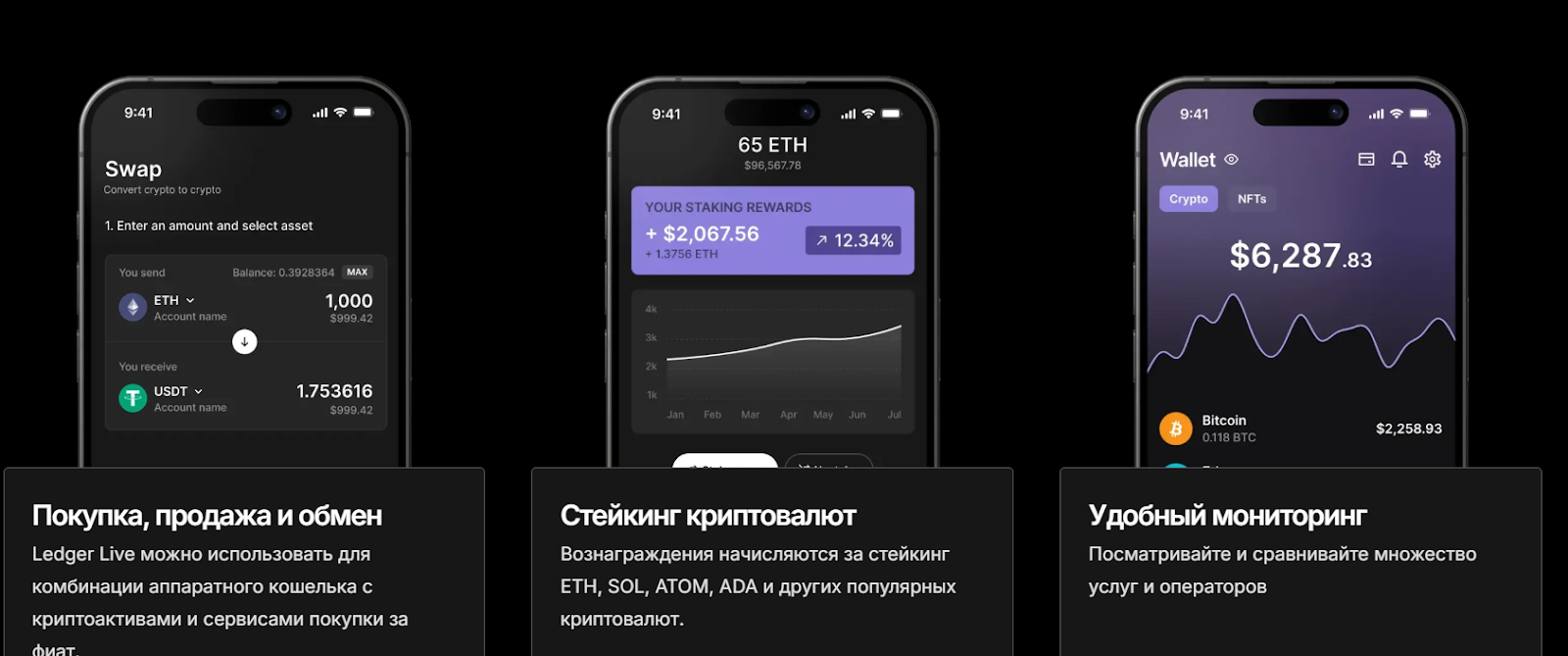 Внутри приложения можно покупать, продавать и обменивать крипту, а стейкинг с помощью холодного кошелька для криптовалюты «Леджер» поможет приумножать капитал пользователей.