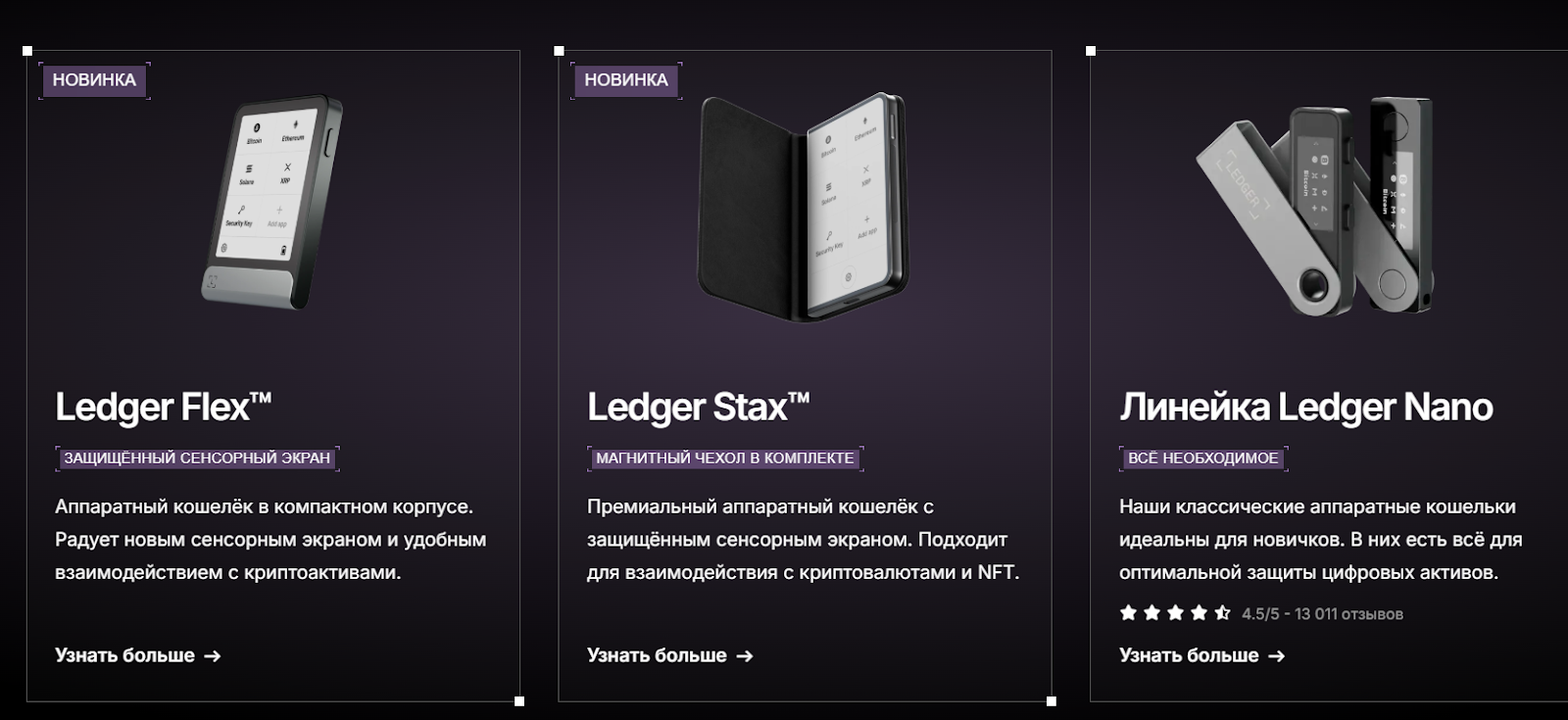 На февраль 2025 года, помимо услуг хранения и перевода крипты, компания не предоставляет никаких дополнительных продуктов. На сайте пользователи могут посмотреть все модели крипто валютных кошельков и подобрать наиболее удобный вариант. Среди вариаций можно встретить как маленькие брелки, так и полноценные планшеты с экраном.