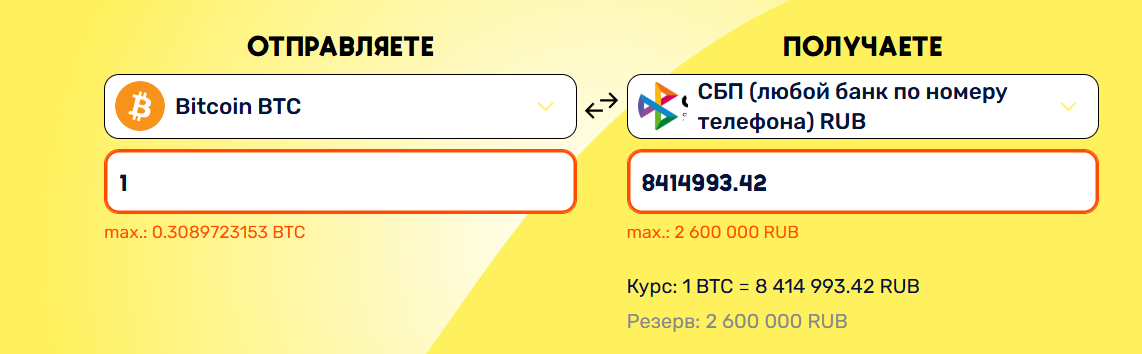 Lemonchik позволяет обменивать биткоины и другую крипту на рубли, выводя их на банковские карты по СБП. Максимальной суммой перевода биткоинов в рубли является ₽2,600,000.