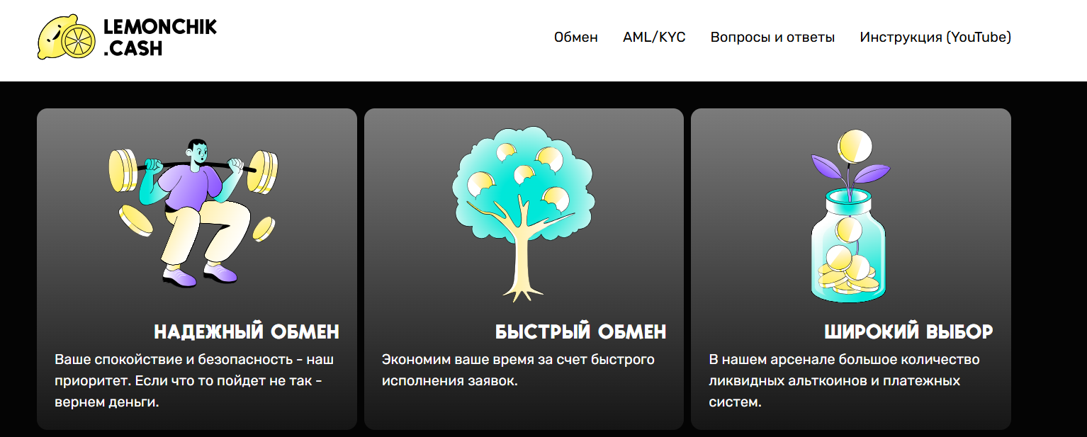 «Лемончик Кэш» предлагает клиентам возможности для обмена крипты, на своем официальном сайте заявляя, что гарантируют спокойствие и безопасность переводов, а в случае если что-то пойдет не так, клиенту вернут деньги. Создатели сообщают, что у них в запасе есть большое количество ликвидных альткоинов и обмены производятся очень быстро.