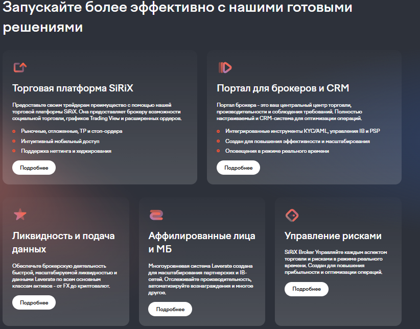 Организация предлагает огромное количество продуктов для решения задач в трейдинге и автоматизации торговых процессов. Например, платформа SiRiX позволяет использовать социальную торговлю и TradingView, платежные рыночные, отложенные, TP и стоп-ордеры, обеспечивает поддержку неттинга и хеджирования. Еще имеются ликвидность и простая подача данных, позволяющая ускорить торговые процессы, масштабировать ликвидность и данные «Леверейт» под соответствующий рынок. Среди типов активов выделяются валютные пары, криптовалюты, FX и другие.