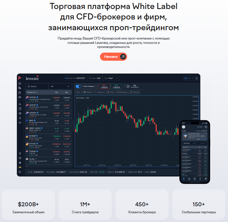 На главной странице сайта администраторы представляют свой надежный продукт и предлагают заработать с помощью заключения сделок на различных торговых платформах. Торговать предлагают, сотрудничая с CFD-брокерами и фирмами, специализирующимися на проп-трейдинге. Организаторы делятся таким финансовым показателем, как ежемесячный объем торговли в $200,000,000,000, заявляют, что на сайте Leverate com более 1 000 000 счетов у трейдеров и более 600 клиентов компании.