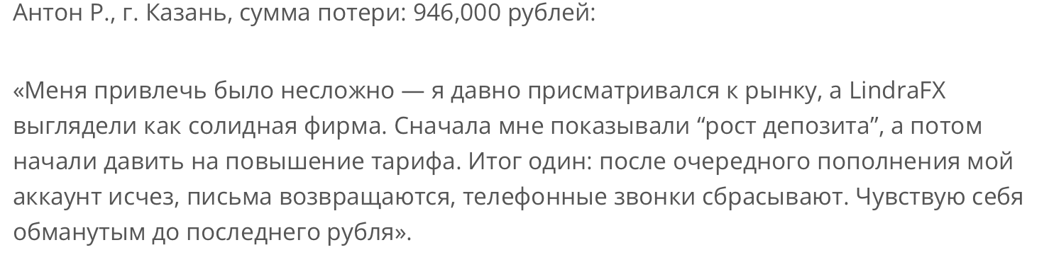 Людей блокировали без объяснения причин, выманивали из них дополнительные платежи, прикрываясь «комиссиями» и «процедурой верификации». Пострадавшие называют Lindra FX лохотроном, единственная цель которого — средства инвесторов.