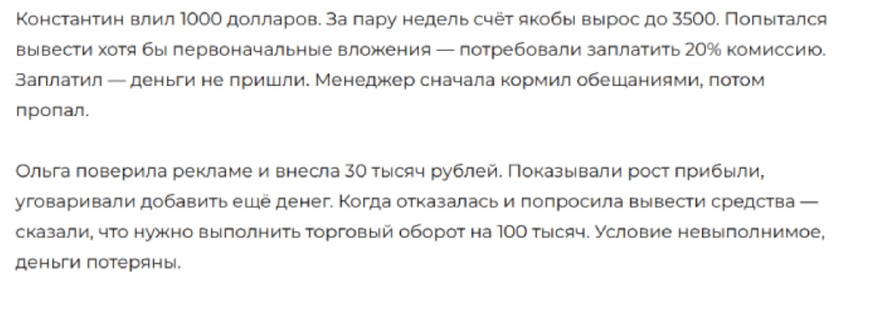 В личном кабинете пользователь видит фейковый график с такими же фальшивыми «плюсами» на сделках. Поверив словам аферистов, игроки решаются на более серьезные депозиты, но в итоге остаются за бортом. Также мошенники любят требовать деньги за вывод средств, что ставит инвесторов в тупик. Желая вывести со счета хотя бы что-нибудь, они выполняют условия скамеров. Связь с ними местная «поддержка» обрывает сразу либо после того, как обманным путем вытянет из них оплату комиссии или «налога».