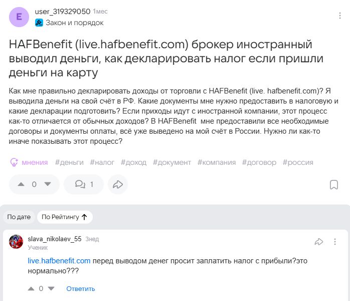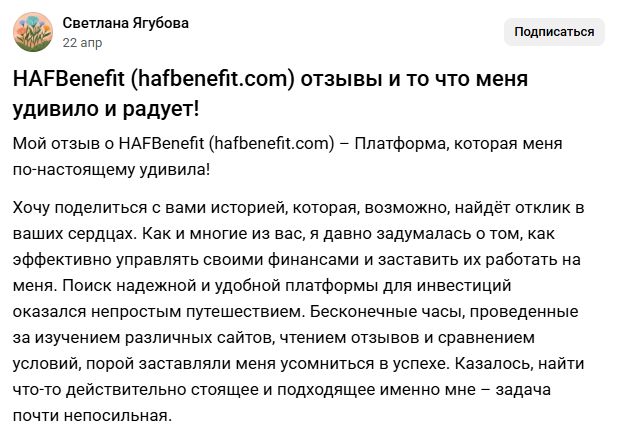 На vc.ru размещена статья-отзыв о Hafbenefit com рекламного характера с призывом зарегистрироваться на платформе. Аккаунт автора свежий, в блоге только одна статья про HAFBenefit, следовательно отзыв скорее всего проплачен самим брокером.