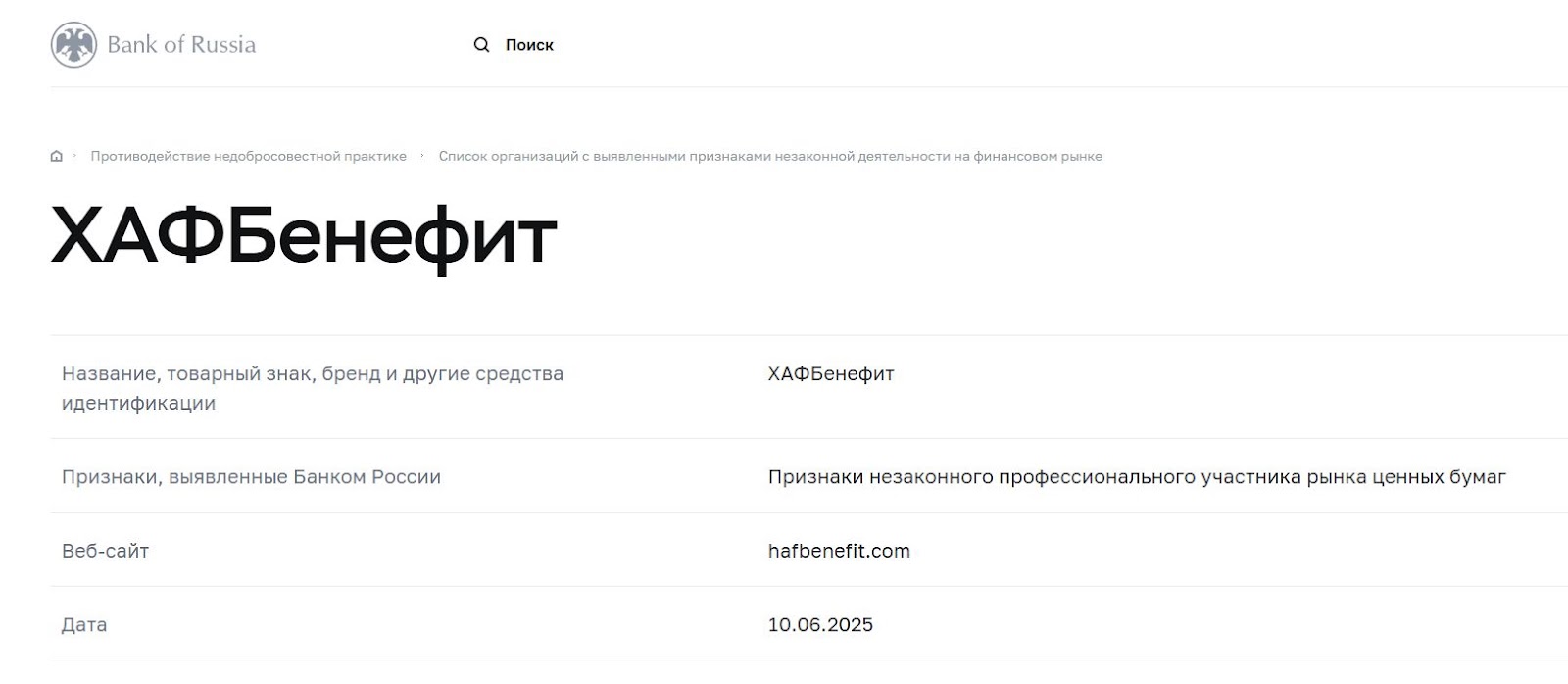 10 июня 2025 года брокер HAFBenefit официально внесен Банком России в реестр в связи с незаконной деятельностью на финансовом рынке.